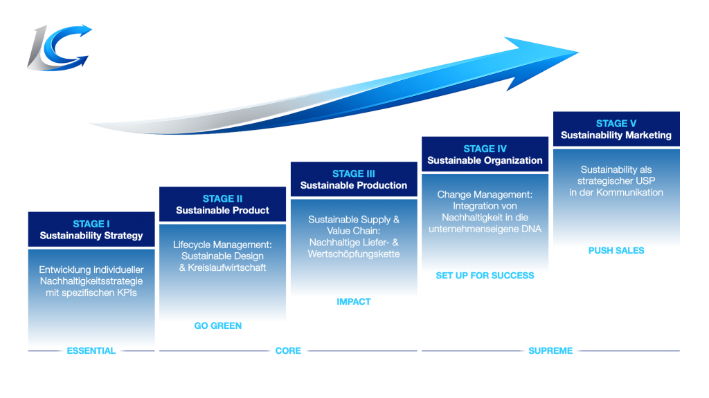 Die fünf Stufen des Lane Change Modells greifen ineinander – von der strategischen Einordnung über Produkt und Produktion bis hin zu Organisation und Marktpositionierung. Jede Stufe schafft die Grundlage für die nächste und sorgt dafür, dass Nachhaltigkeit nicht nur dokumentiert, sondern tatsächlich einflussreich gesteuert und schießlich kommuniziert wird.